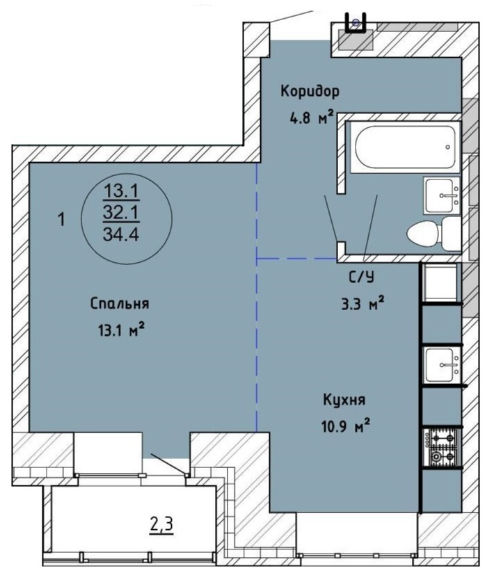 Лоджия - 2,3 м²